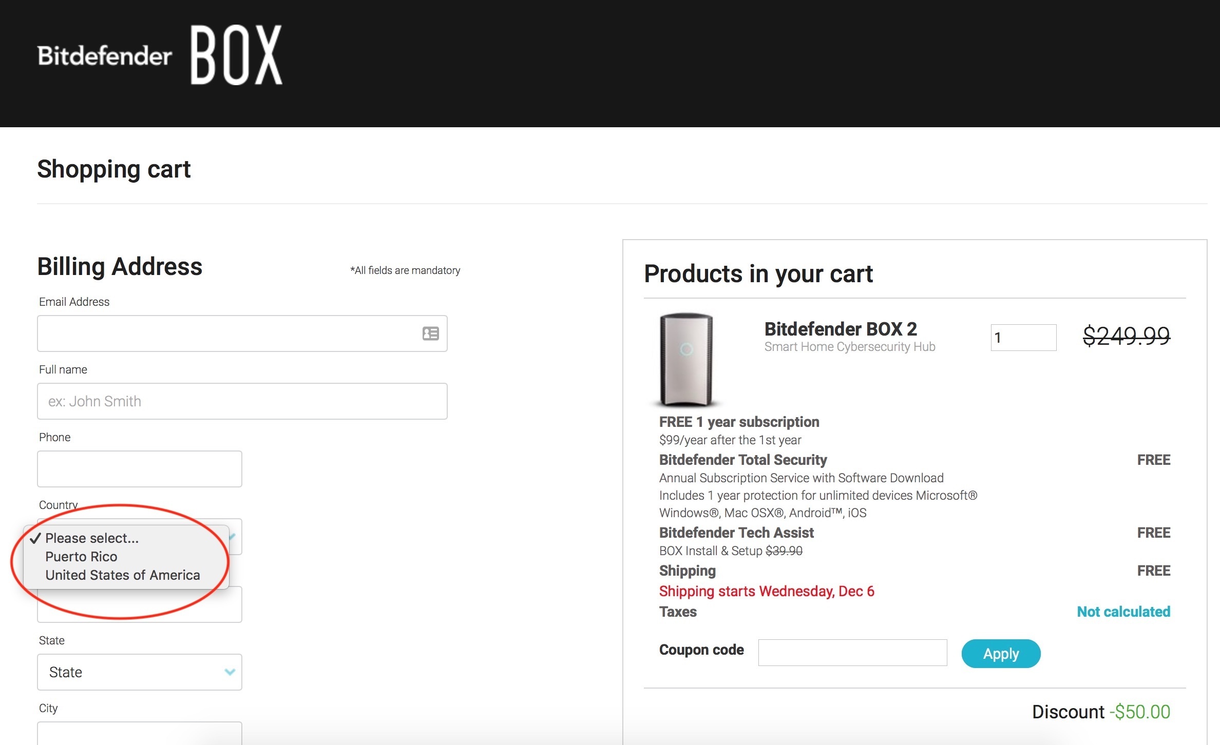 Dar livrează doar în SUA și în Puerto Rico (gratis, ce-i drept 🙂 ). Trebuie să rog un prieten să-mi cumpere de acolo. Ultima experiență cu Bitdefender BOX 1 nu a fost una fericită și am fost chiar certat și jignit de un băiat de la Bidefender. Sper că a doua încercare va fi una mai fericită.