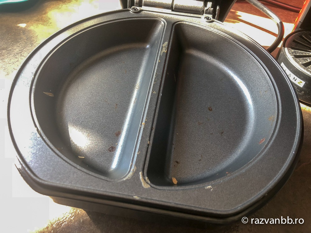 Așa ca aparat e o construcție simplă ca și făuritorul de burgeri. Arată la fel ca un toaster dar cu alte forme. Nu are buton de pornit oprit și practic sunt două rezistențe cu un termostat care încălzesc formele alea.