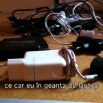 Prefer o geanta cu mai multe buzunare 🙂 am o geanta hp de piele, pentru laptopuri de 17 wide si in ea car asa: laptop, incarcator laptop, mouse dimensiuni normale, pe usb, rack hdd 3.5 + alimentator + cablu usb, cablu date telefon, modem 3g, carti vizita, un stick bluetooth, agenda, incarcator telefon, aparat foto (sapuniera nikon), doua pixuri, o sticluta cu pastile de ketonal, servetele de sters displayul, handsfree-ul bluetooth (cand nu e pe ureche), un patch-cord, un cdrw….si cam atata (cred)